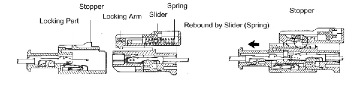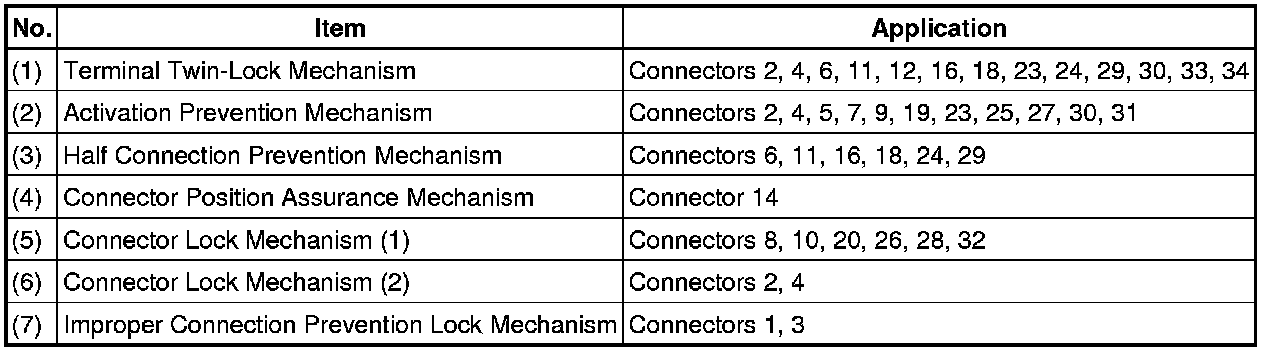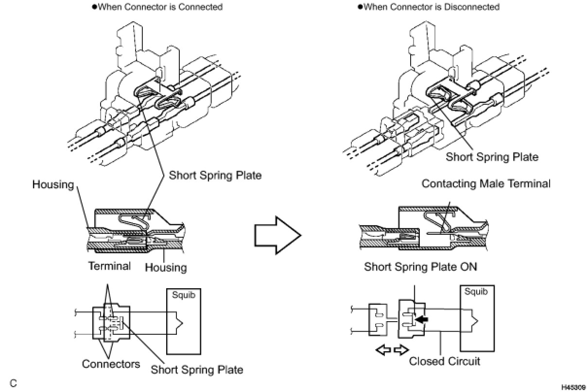 All connectors with an activation prevention mechanism contain a short spring plate. When these connectors are disconnected, the short spring plate creates a short circuit by automatically connecting the positive (+) and negative (-) terminals of the squib.