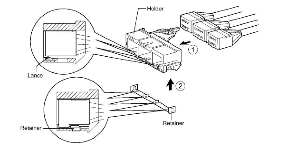 The holder slides into the center airbag sensor assembly when it is being connected. Be sure not to hold the holder while connecting, as it may result in an insecure fit.