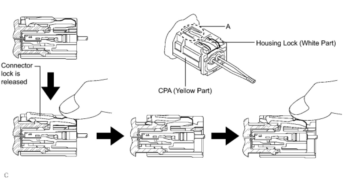 (a) Push down the housing lock (white part) and slide the CPA (yellow part). (At this time, the connector cannot be disconnected yet.)