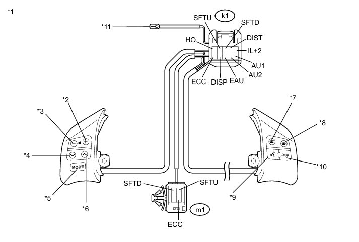 (1) Connect a positive (+) lead to terminal IL+2 and a negative (-) lead to terminal EAU of the steering pad switch assembly connector.