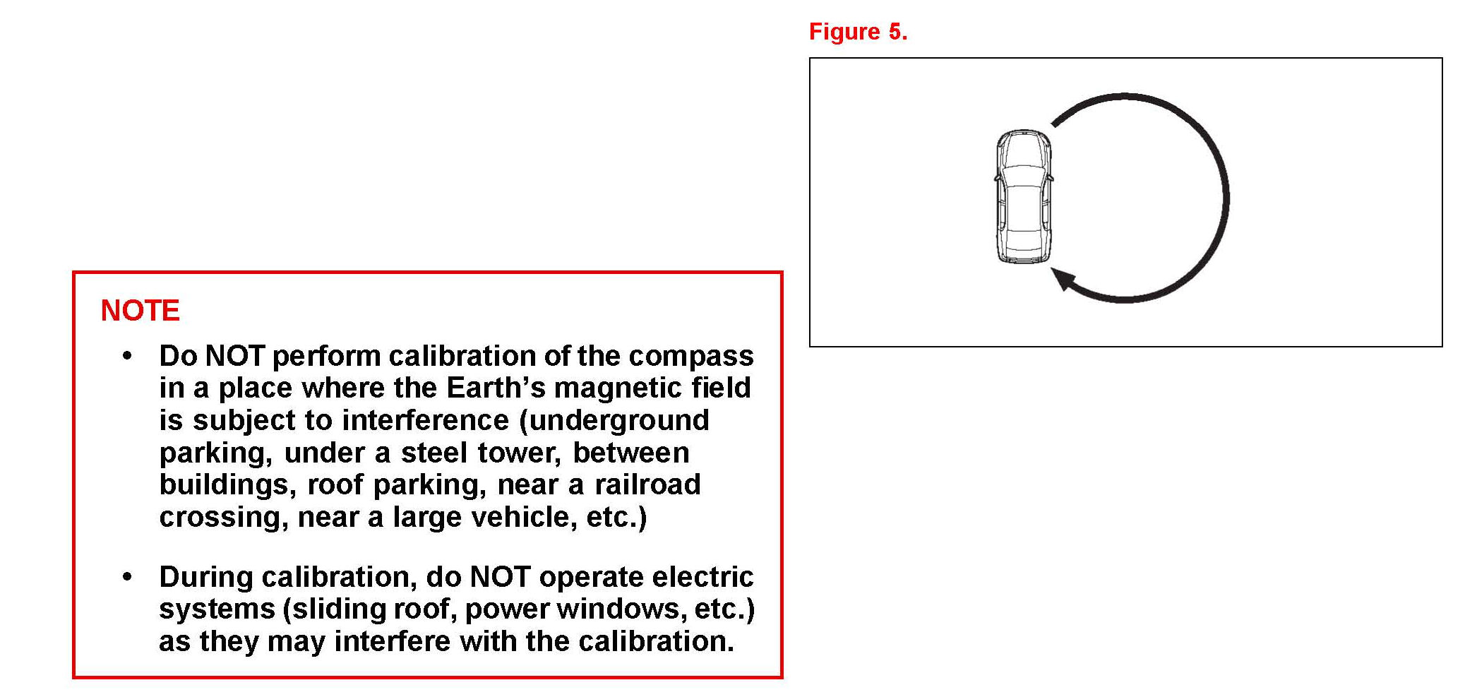 4. Drive the vehicle slowly at 5 mph (8 km/h), or less, in a circle until the direction is displayed. If there is NOT enough space to drive in a circle, drive around the block until the direction is displayed.