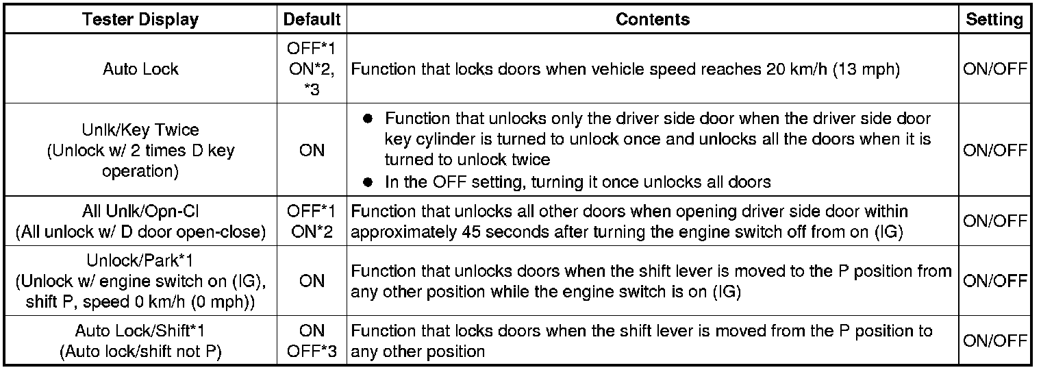 * *1: This function is linked with the power window key-linked function. If the power window key-linked function is set to OFF, the sliding roof key-linked function will not operate even when it is set to ON.