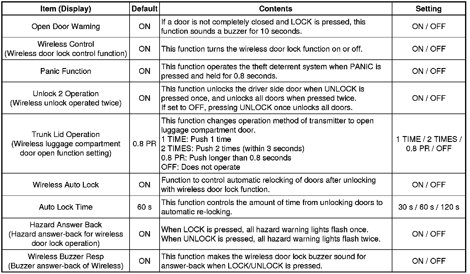 * Driver door unlock default setting: