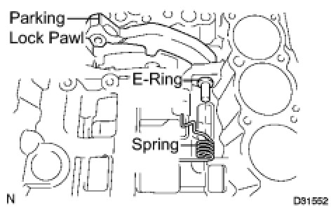 (b) Install the parking lock pawl, the parking lock pawl shaft and the parking lock pawl torsion spring.