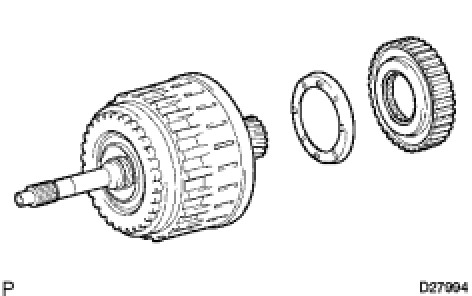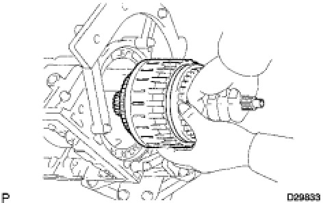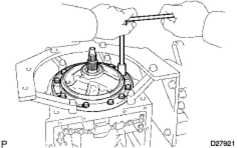 (d) Hold the input shaft, and lightly press the oil pump body to slide the oil seal rings into the clutch drum and input shaft.