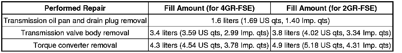 (a) Fill the transmission with the correct amount of fluid as listed in the table below.
