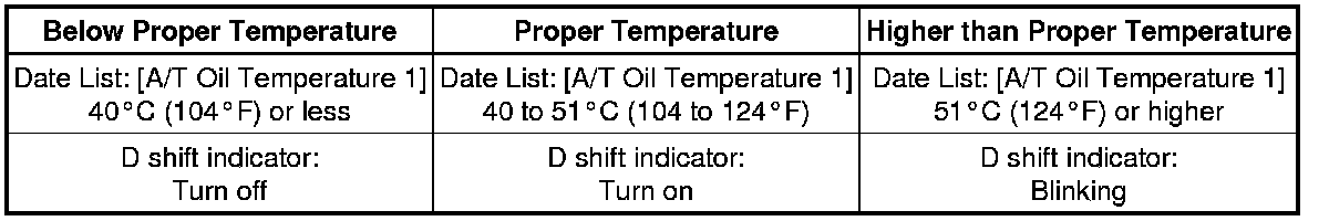 The fluid temperature can be confirmed by checking the D shift indicator in the meter or by the Techstream. It is necessary to change to fluid temperature detection mode.