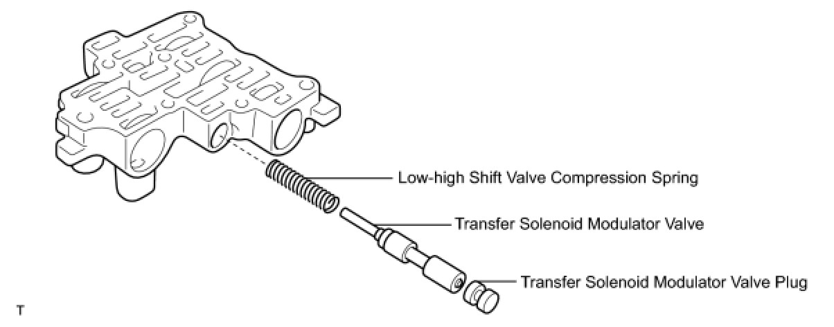 (a) Install the low-high shift valve compression spring, transfer solenoid modulator valve and transfer solenoid modulator valve plug to the transfer upper valve body.