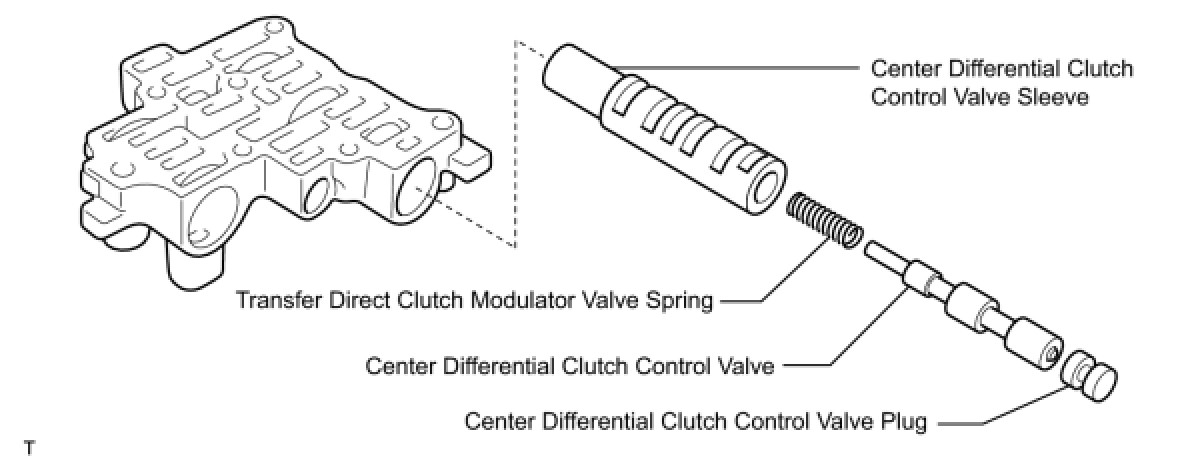 (a) Install the center differential clutch control valve sleeve, transfer direct clutch modulator valve spring, center differential clutch control valve and center differential clutch control valve plug to the transfer upper valve body.