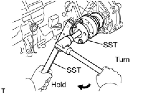 (c) Place SST on the center differential clutch pressure balancer, and compress the return spring with a press.