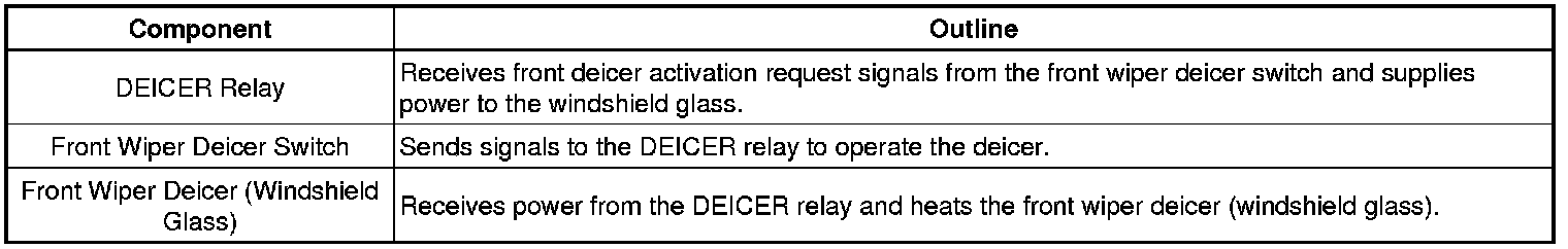 The windshield deicer system thin heater wires are attached to the inside of the windshield to help deice the window surface more quickly. The indicator light illuminates while the system is operating. The system automatically turns off after approximately 15 minutes.