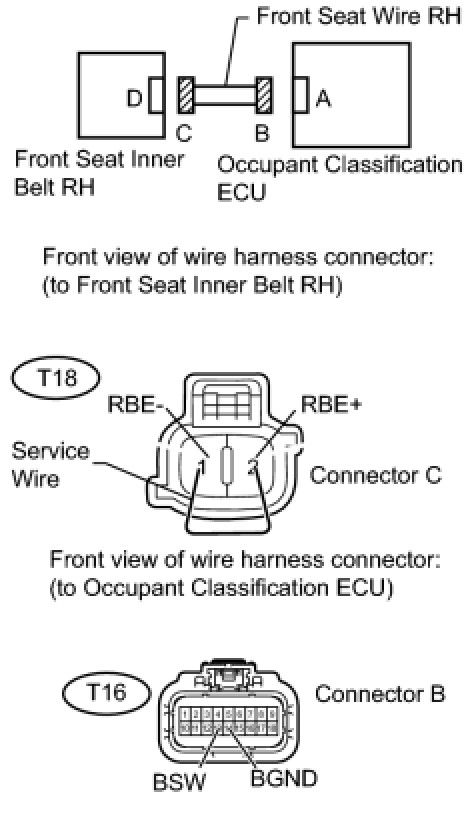 (c) Check that the connectors are properly connected to the occupant classification ECU and the front seat inner belt RH.