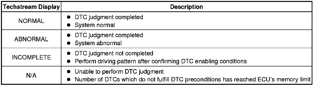 16. If the test result is INCOMPLETE or N/A and no pending DTC is output, perform a universal trip and check for permanent DTCs Reading and Clearing Diagnostic Trouble Codes.