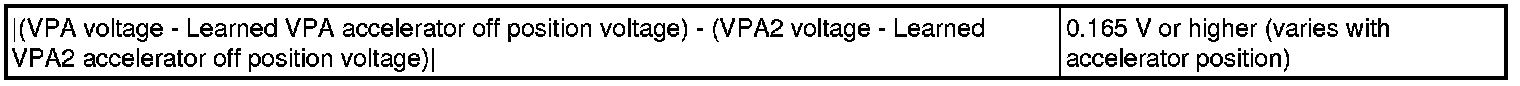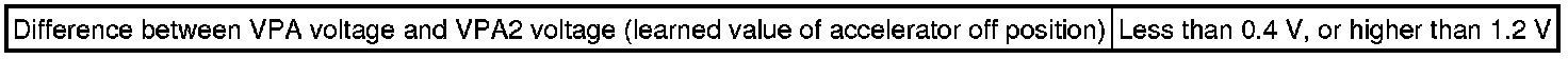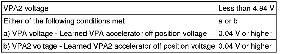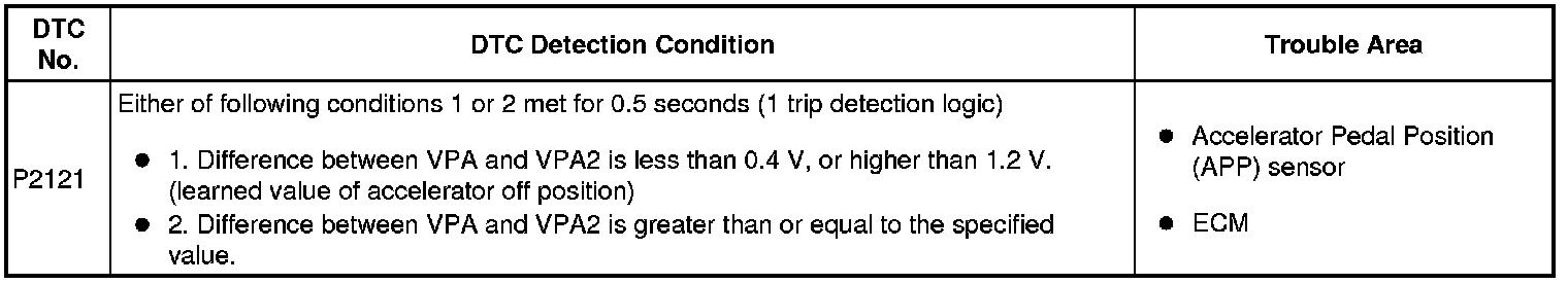 The accelerator pedal position sensor is mounted on the accelerator pedal bracket. The accelerator pedal position sensor has 2 sensor elements and 2 signal outputs: VPA and VPA2. VPA is used to detect the actual accelerator pedal angle (used for engine control) and VPA2 is used to detect malfunctions in VPA. When the difference between the output voltages of VPA and VPA2 deviates from the standard, the ECM determines that the accelerator pedal position sensor is malfunctioning. The ECM turns on the MIL and set the DTC.