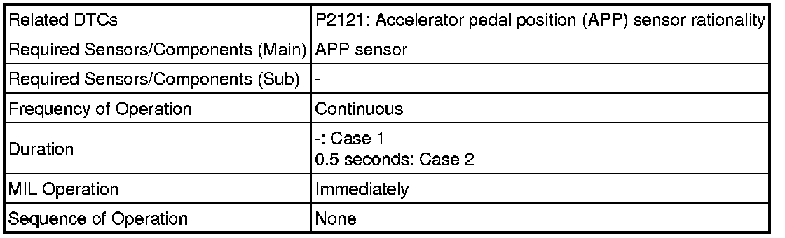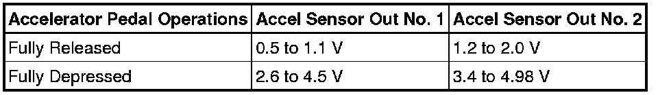 The accelerator pedal position sensor has two (main and sub) sensor circuits. If a malfunction occurs in either of the sensor circuits, the ECM detects the abnormal signal voltage difference between the two sensor circuits and switches to limp mode. In limp mode, the functioning circuit is used to calculate the accelerator pedal opening angle to allow the vehicle to continue driving. If both circuits malfunction, the ECM regards the opening angle of the accelerator pedal as being fully closed. In this case, the throttle valve remains closed as if the engine is idling.