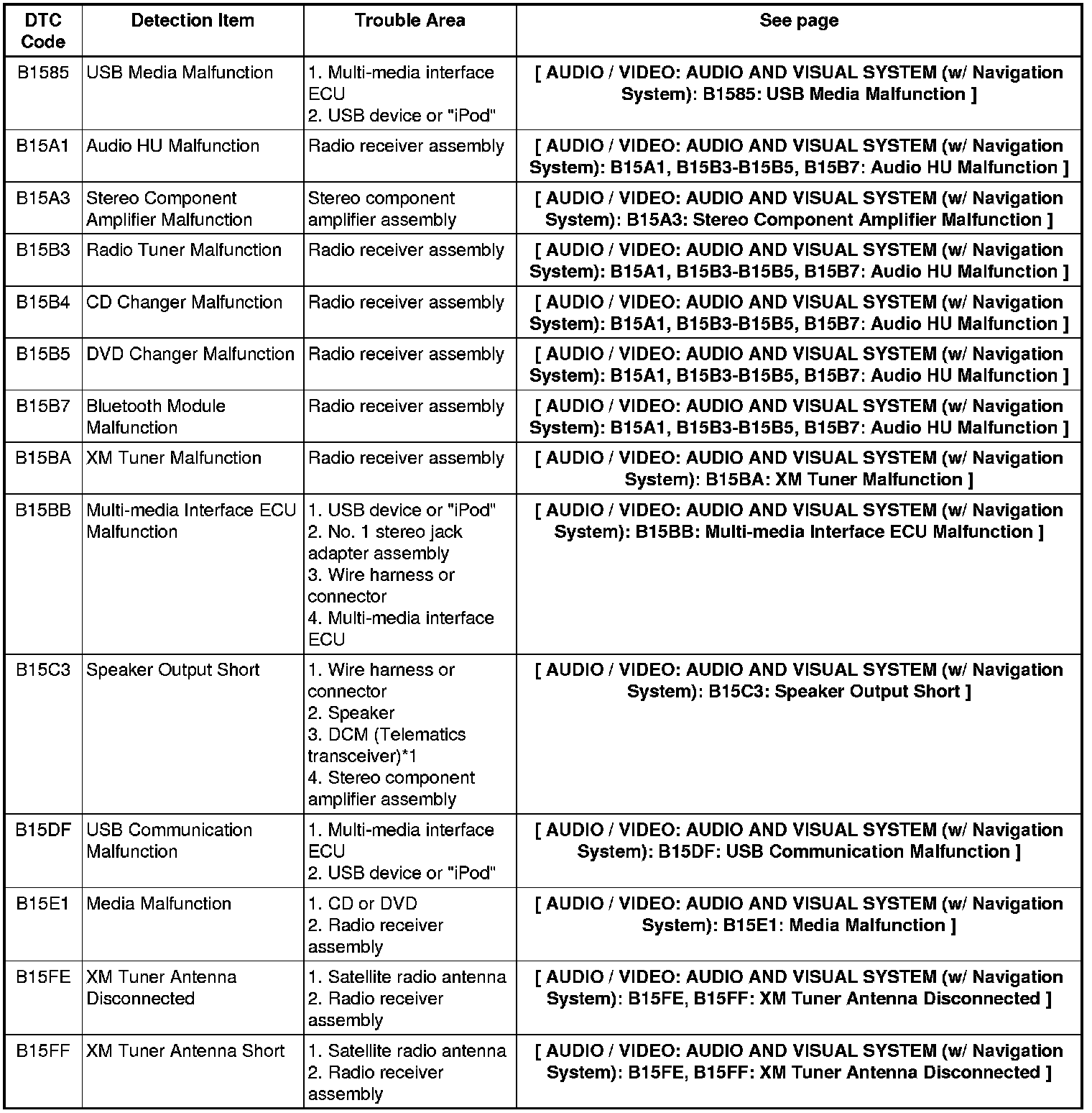 AUDIO / VIDEO: AUDIO AND VISUAL SYSTEM (w/ Navigation System): DIAGNOSTIC TROUBLE CODE CHART NOTICE: After replacing the radio receiver assembly of vehicles subscribed to pay-type satellite radio broadcasts, the XM radio ID registration is necessary. (w/ SDARS System)Audio and Visual System *