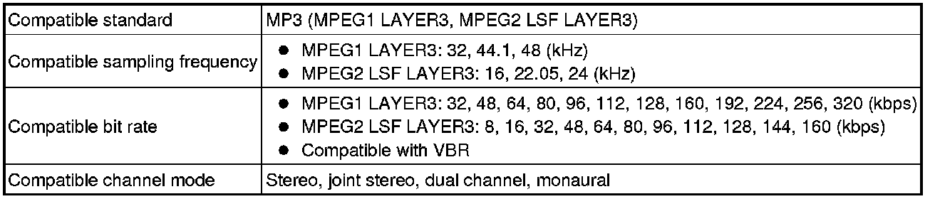 * As for MP3/WMA files written in any unlisted format, the contents of the files may not be played normally or the file names or folder names may not be displayed correctly.