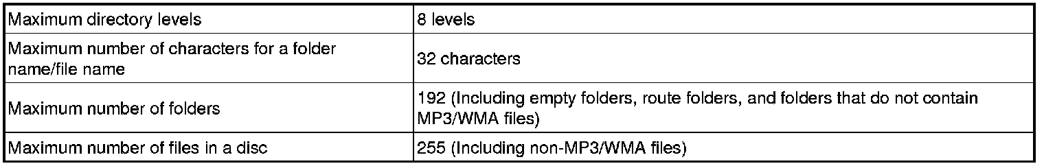 MP3 and WMA files written in any format other than those listed above may not play correctly, and their names and folder names may not be displayed correctly.
