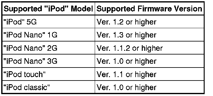 * "iPod" models and firmware versions that are not listed in "Supported "iPod" Models and Firmware Versions" may not function, or may not function correctly.
