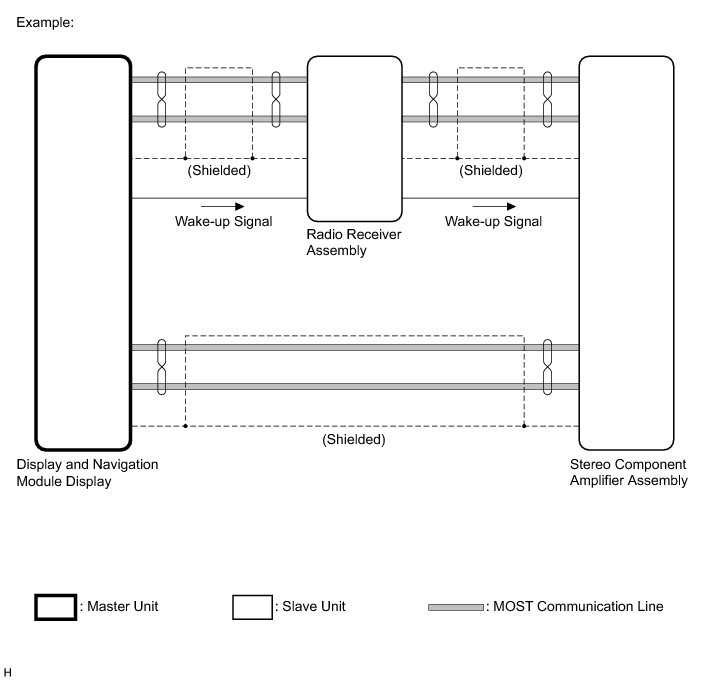 (4) MOST communication lines connect each slave unit centering around the master unit to form a MOST network ring.