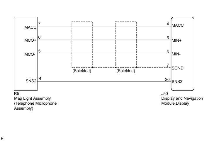 This circuit sends a microphone signal from the map light assembly (telephone microphone assembly) to the display and navigation module display.