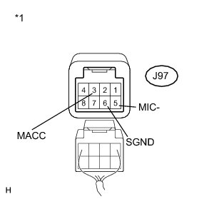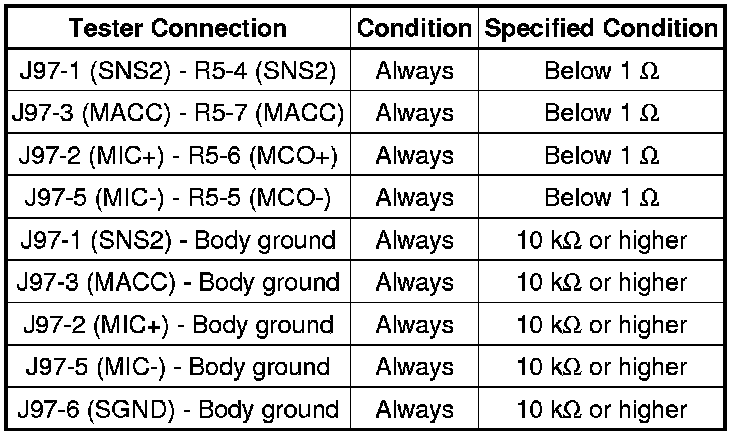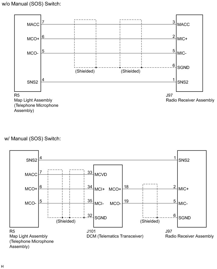 Using this circuit, the DCM (telematics transceiver) sends power to the map light assembly (telephone microphone assembly), and the map light assembly (telephone microphone assembly) sends microphone signals to the radio receiver assembly via the DCM (telematics transceiver). The radio receiver assembly and map light assembly (telephone microphone assembly) are connected to each other using the microphone connection detection signal lines.