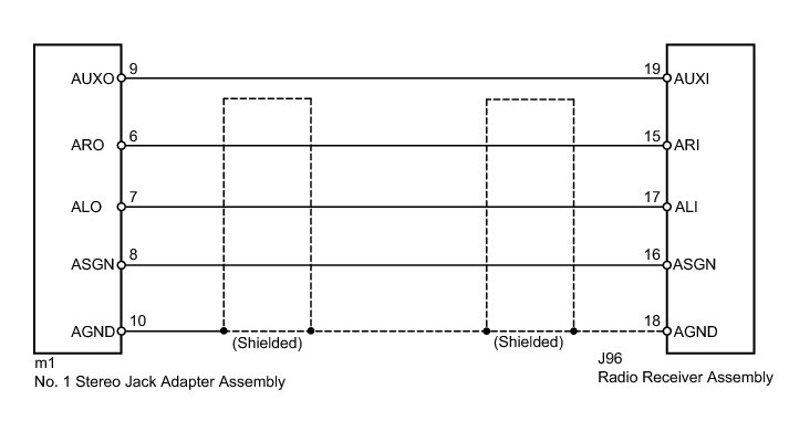 The No. 1 stereo jack adapter assembly sends the sound signal from an external device to the radio receiver assembly through this circuit.