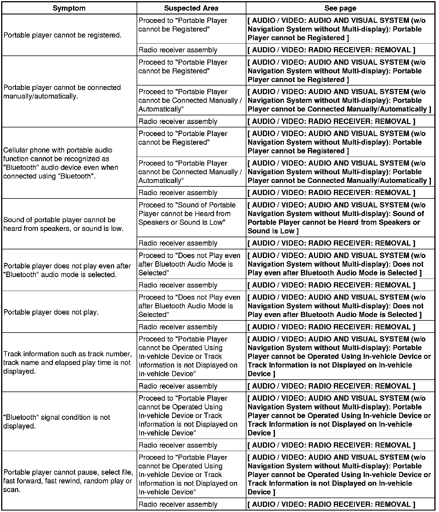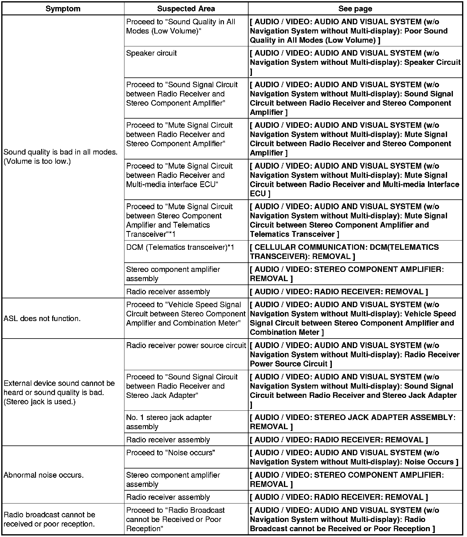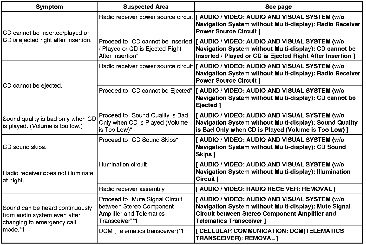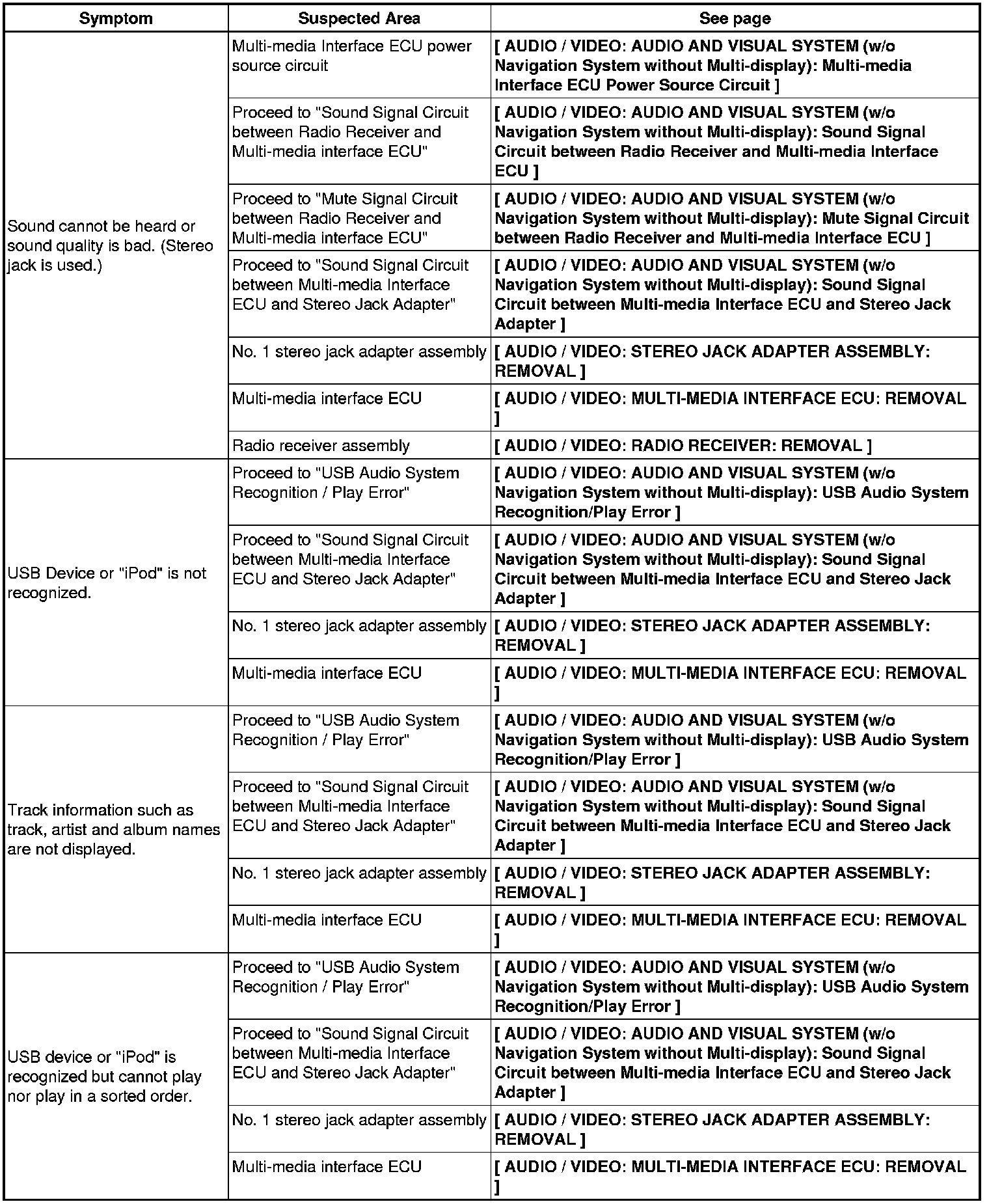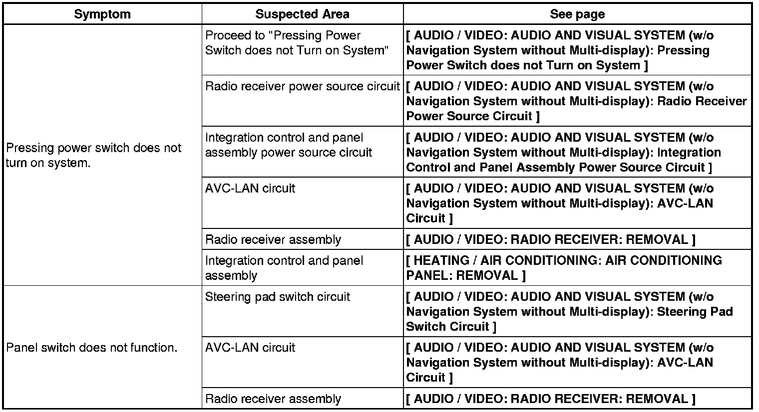 AUDIO / VIDEO: AUDIO AND VISUAL SYSTEM (w/o Navigation System without Multi-display): PROBLEM SYMPTOMS TABLE