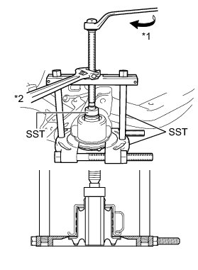 (a) Using SST, remove the rear suspension member front body mounting cushion, while applying grease to the clearance between the rear suspension member front body mounting cushion and the rear suspension member sub-assembly.