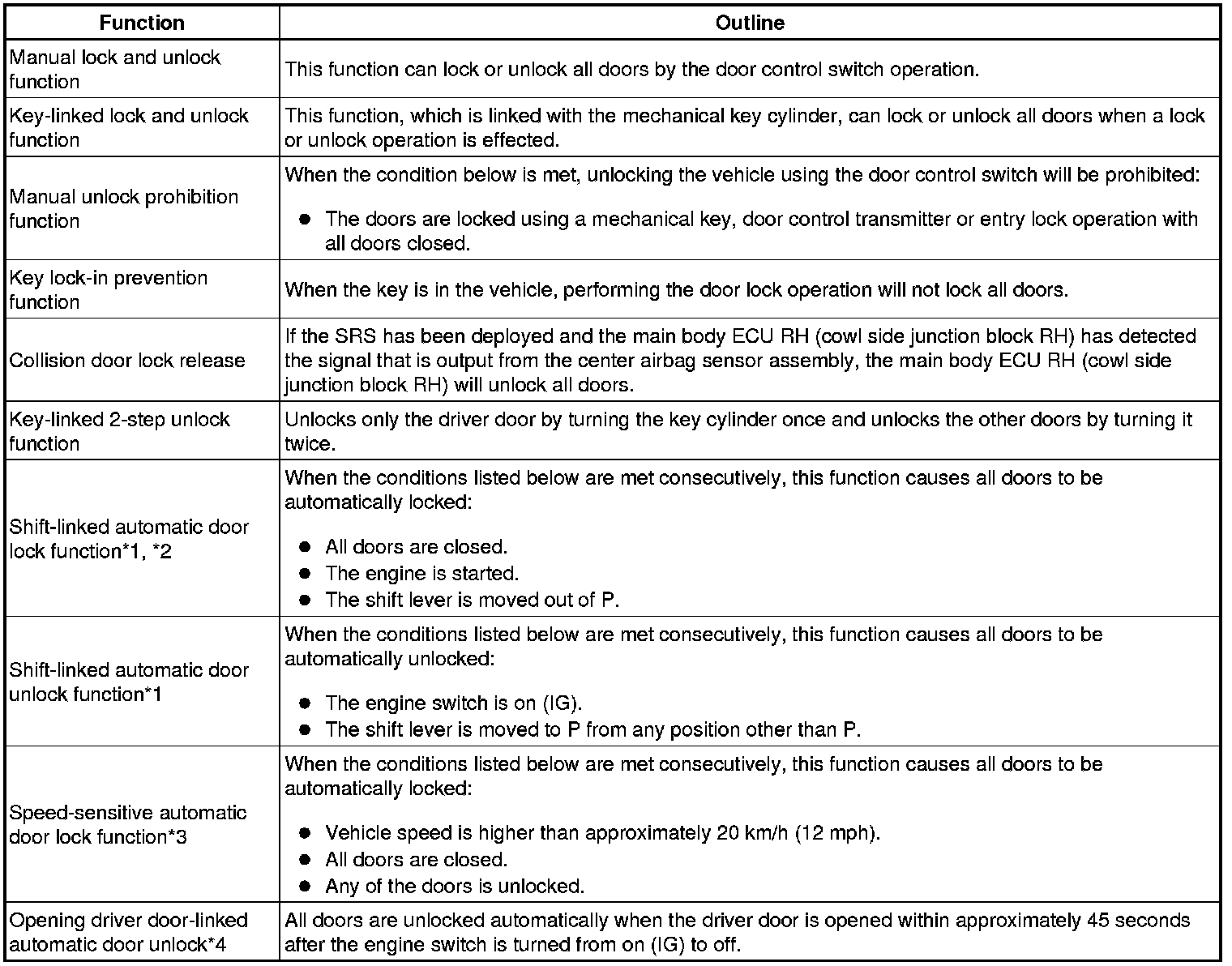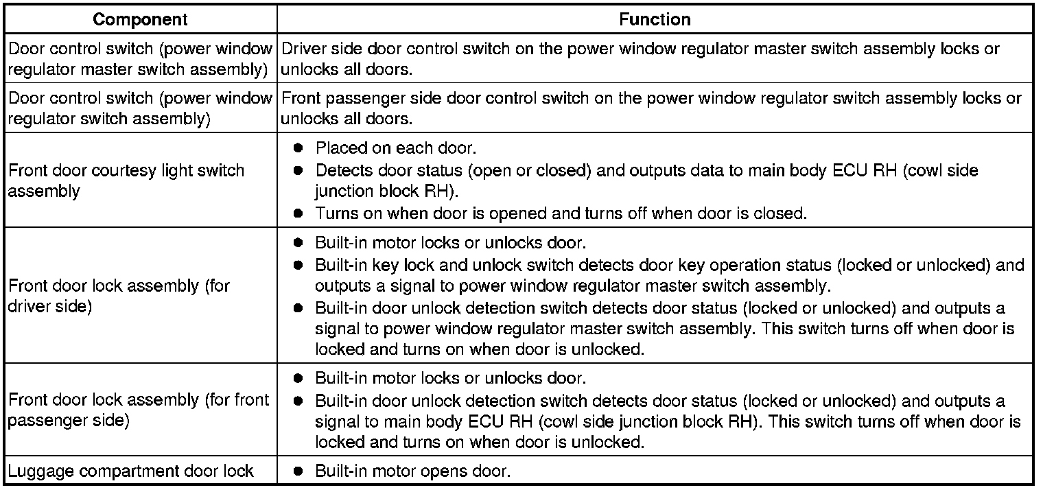 (a) This system is controlled by the main body ECU RH (cowl side junction block RH). The main body ECU RH (cowl side junction block RH) outputs signals to each door lock motor. The power door lock control system has the following functions: