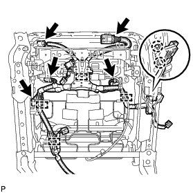 (b) Disengage the 4 clamps and 2 claws, and remove the front seat wire from the front seat frame assembly with adjuster.