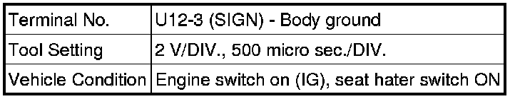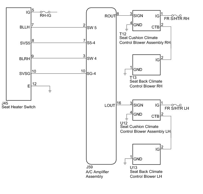 The A/C amplifier assembly receives seat heater switch position signals when the engine switch is on (IG), and then transmits airflow amount signals to each seat climate blower.