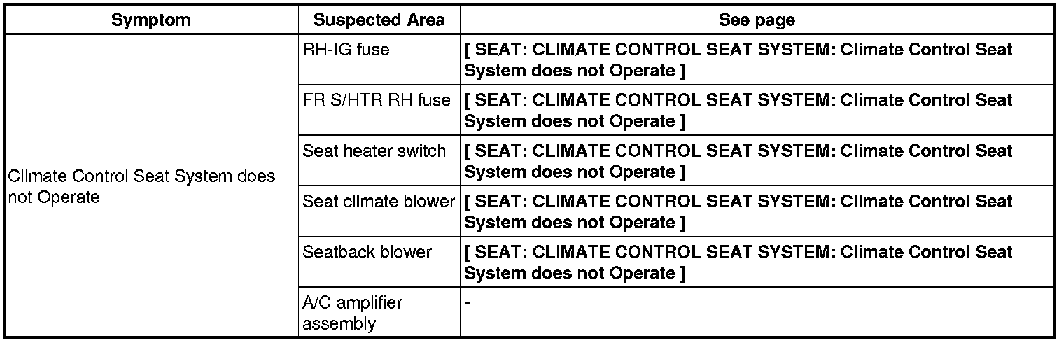 SEAT: CLIMATE CONTROL SEAT SYSTEM: PROBLEM SYMPTOMS TABLE