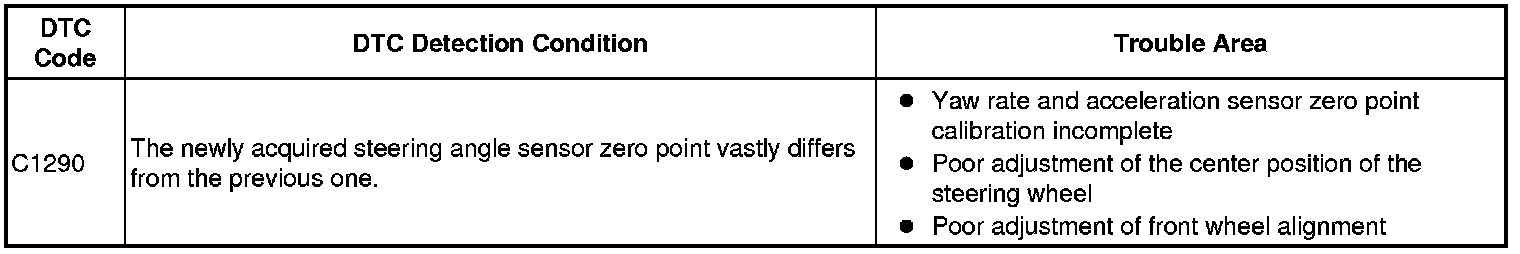 If the front wheel alignment or the steering wheel position is adjusted without disconnecting the cable from the negative (-) battery terminal, or if the yaw rate and acceleration sensor zero point is not acquired after the adjustments have been completed, the skid control ECU detects the difference between the previous zero point and newly acquired zero point and outputs this DTC to indicate a poor adjustment.