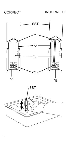 (b) Insert the tip of SST into the valve lash adjuster assembly plunger and use the tip to press down on the check ball inside the plunger.