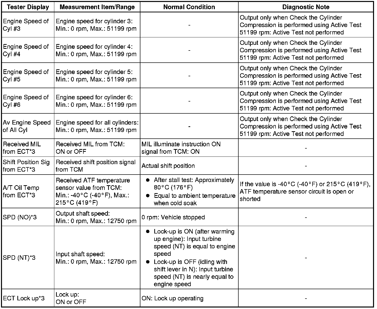 In this Active Test, the fuel and ignition of all cylinders is cut. The engine must then be cranked for approximately 10 seconds. At this time, the speed of each cylinder is measured. If the speed of one cylinder is more than the other cylinders, it can be determined that the compression pressure of that cylinder is lower than the other cylinders.