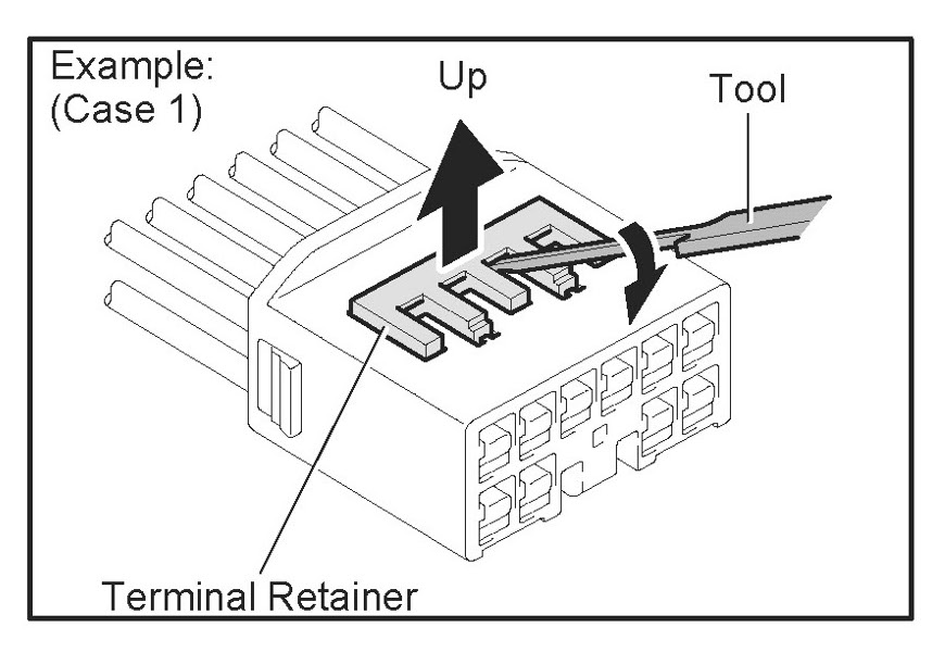 HINT: To remove the terminal from the connector, please construct and use the special tool or like object shown on the left.