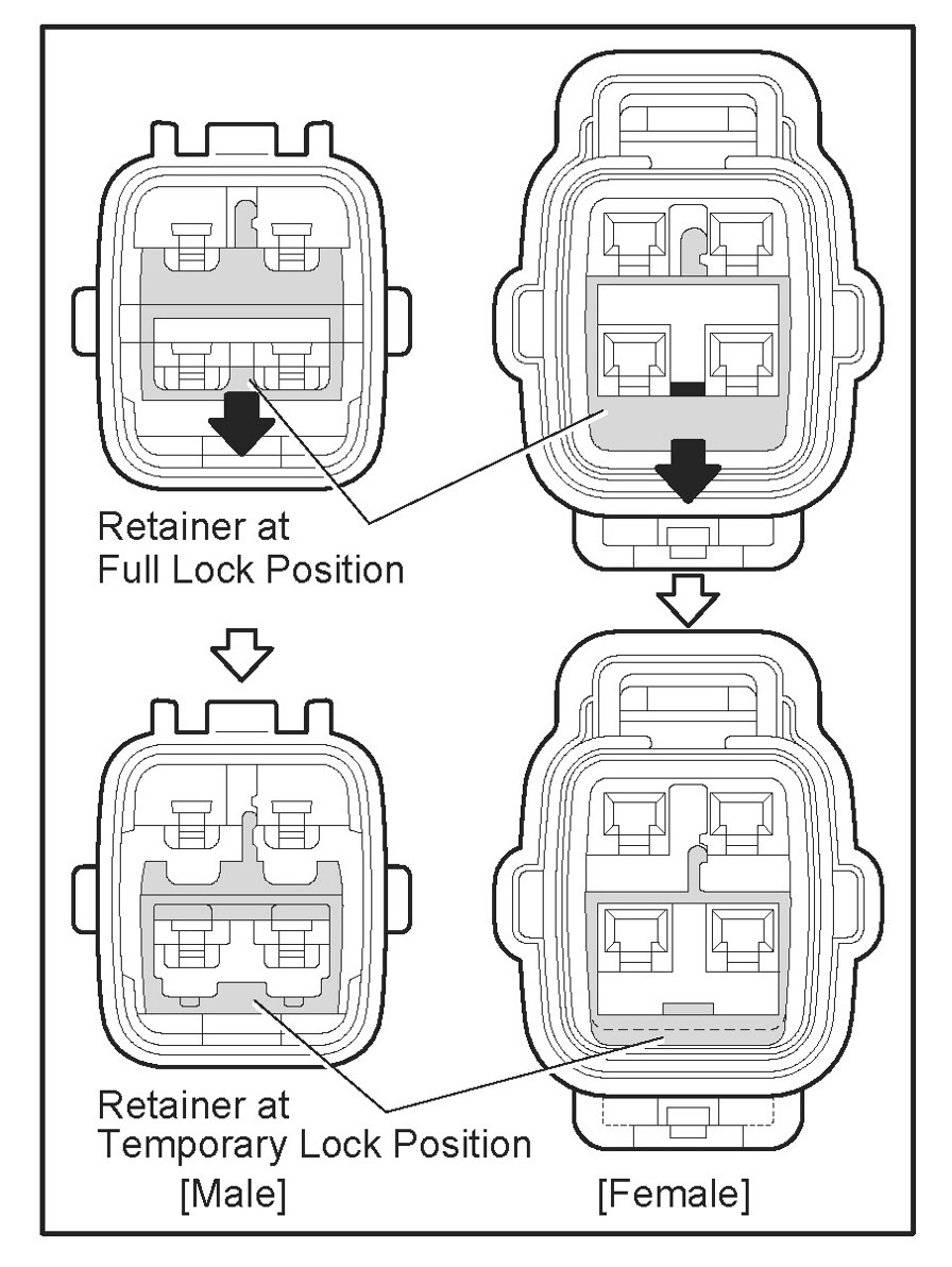 Insert the special tool into the terminal retainer access hole (triangle Mark) and pull the terminal retainer up to the temporary lock position.