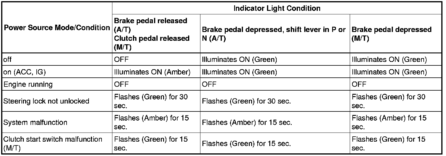 Engine start conditions or system malfunctions can be checked by the status of the engine switch indicator light.