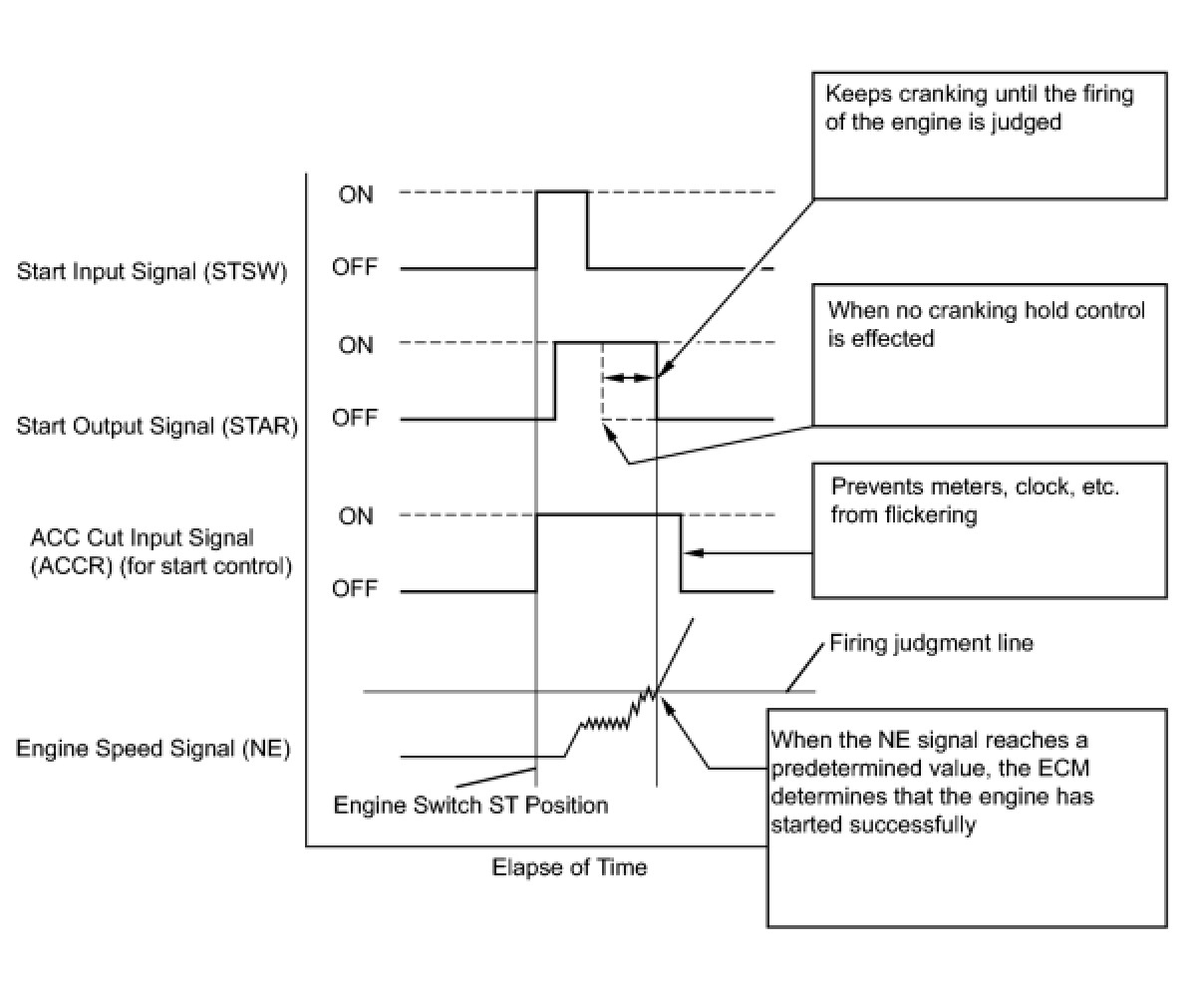 The cranking holding control system provides current to the starter when the ECM detects the engine switch's start signal (STSW). When the ECM performs a firing judgment, the system cuts current to the starter. When an ECM receives the STSW signal, it turns on the ST CUT relay, which prevents flickering of the combination meter, clock, audio system, etc. Also, the ECM sends a signal to the ECM's STAR terminal. Then the STAR output signal travels through the park/neutral position (PNP) switch to the STARTER relay, causing the starter to activate.