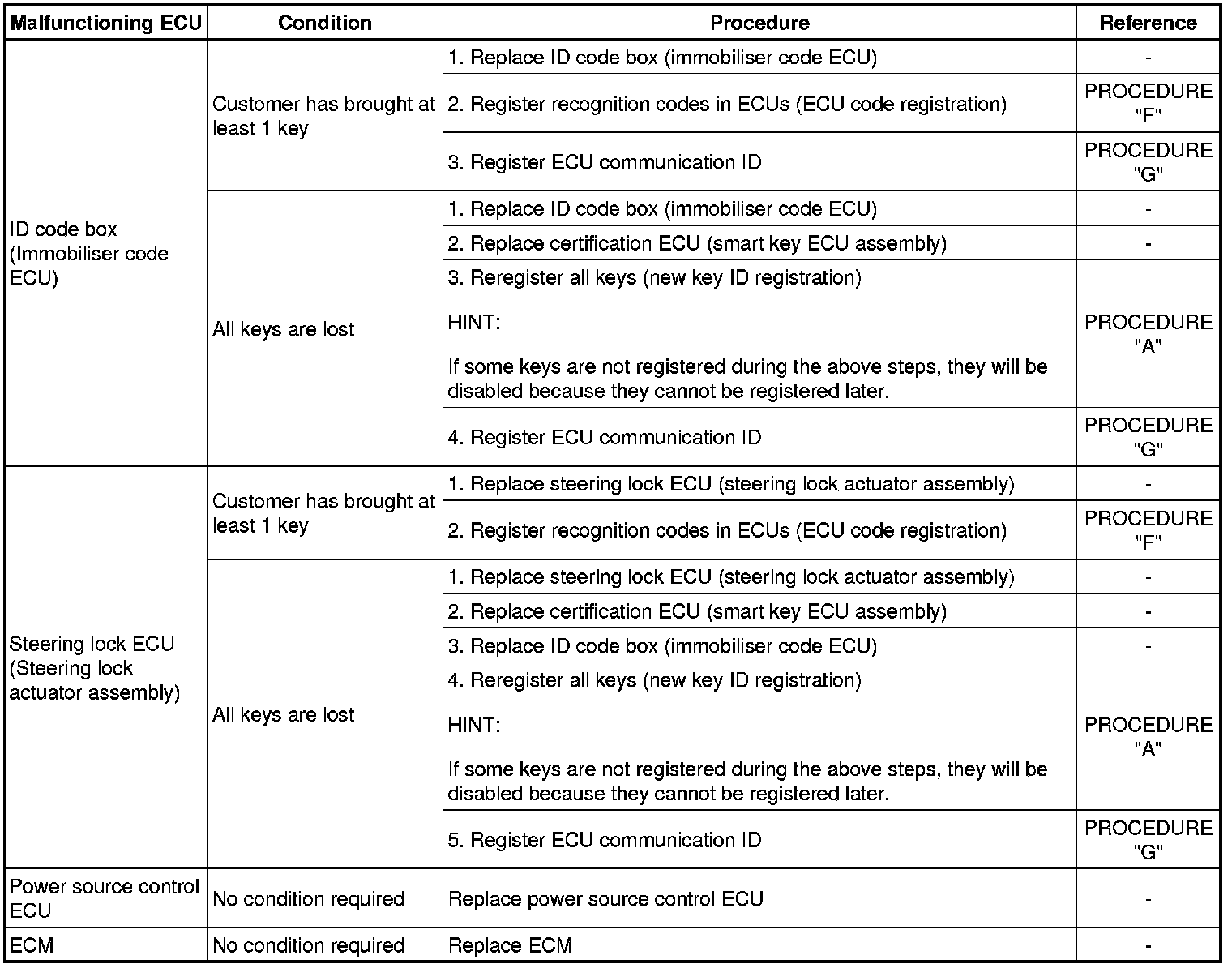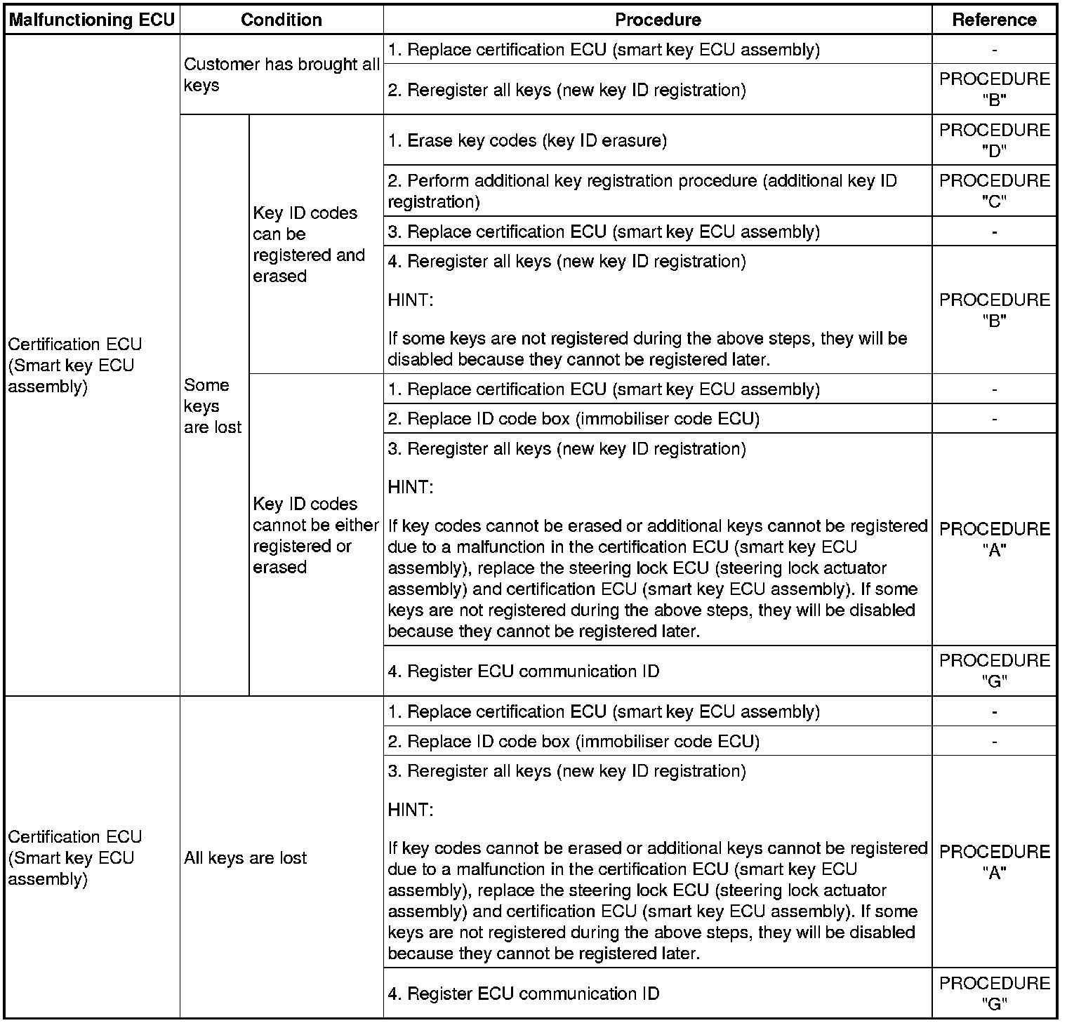 (a) The following table shows ECU replacement and key registration procedures for cases in which a malfunctioning ECU has been identified through the troubleshooting of the smart access system with push-button start.