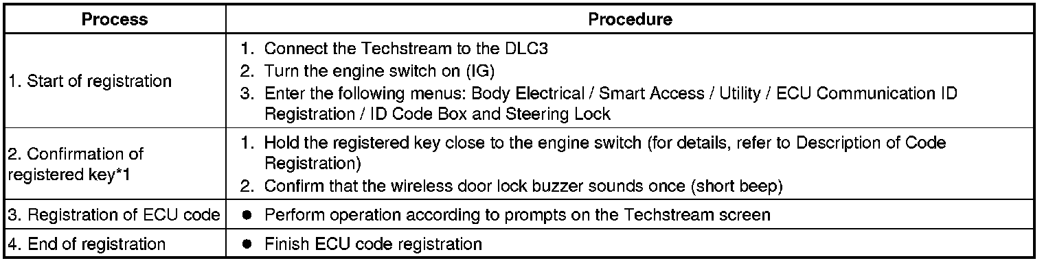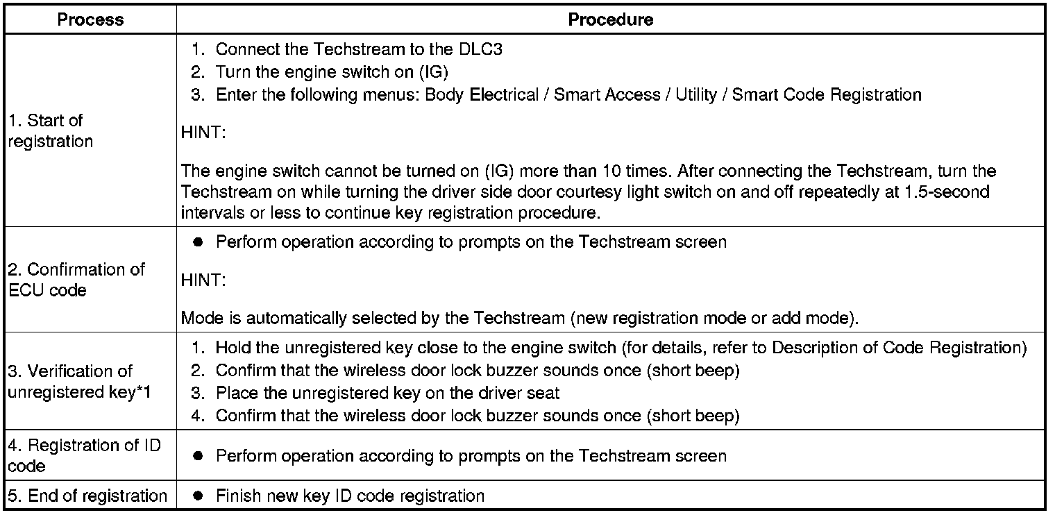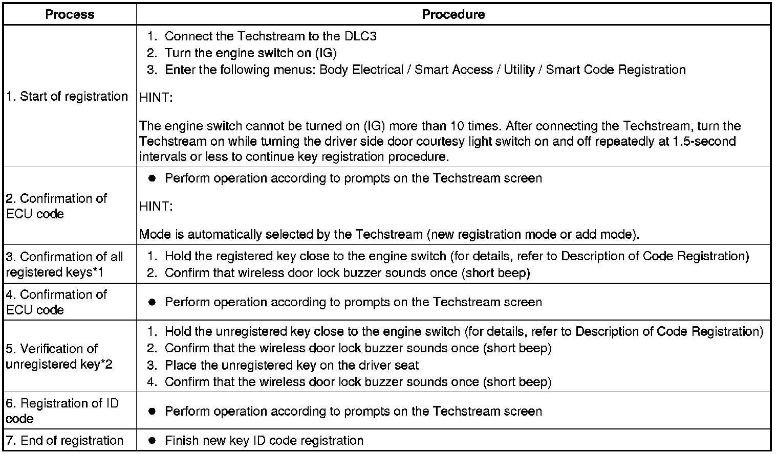 * *1: Perform this process for one of the keys which are to be registered for the vehicle. Finish the procedure within 30 seconds. If the procedure has not been finished within the specified time, perform the registration procedures again from process 1.