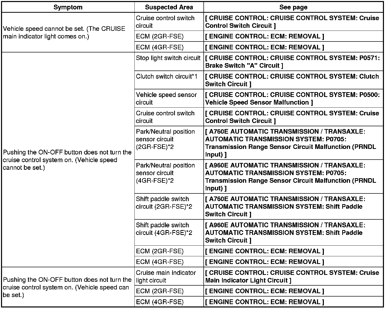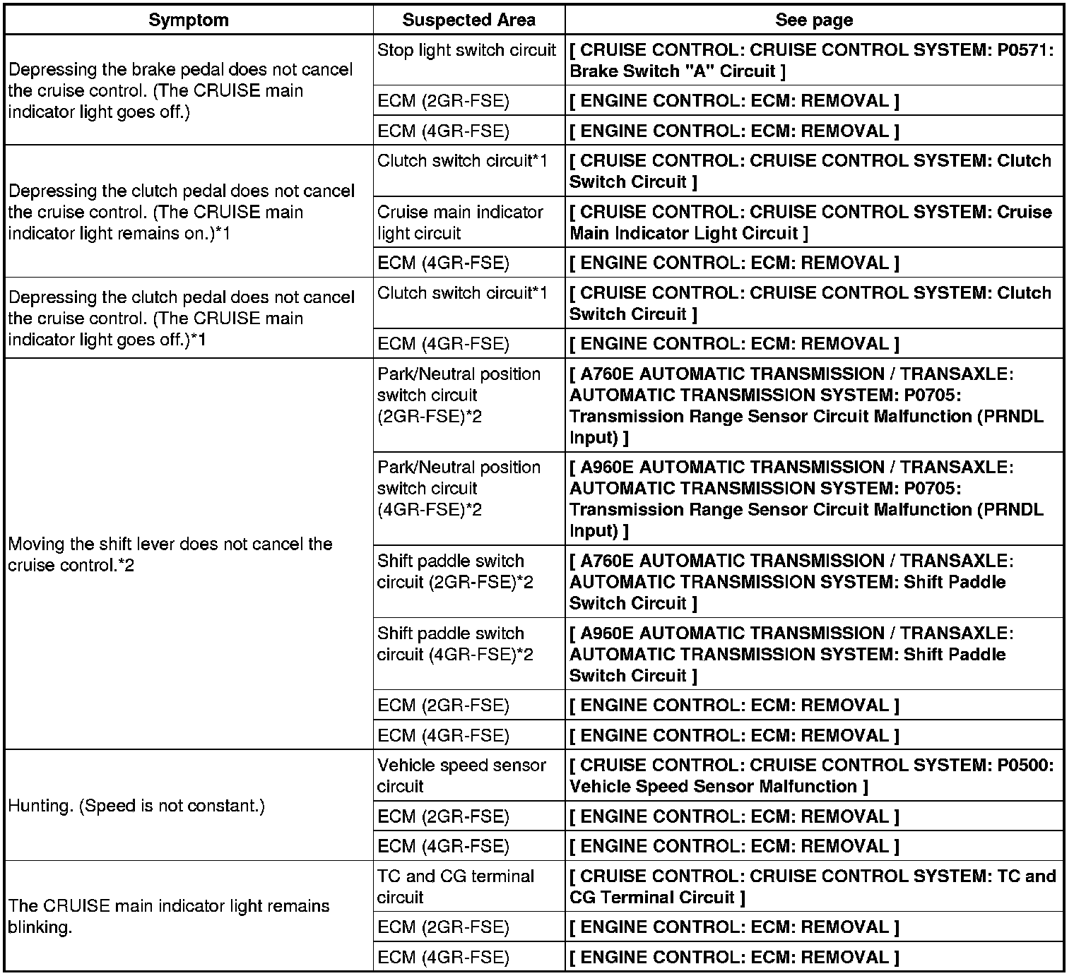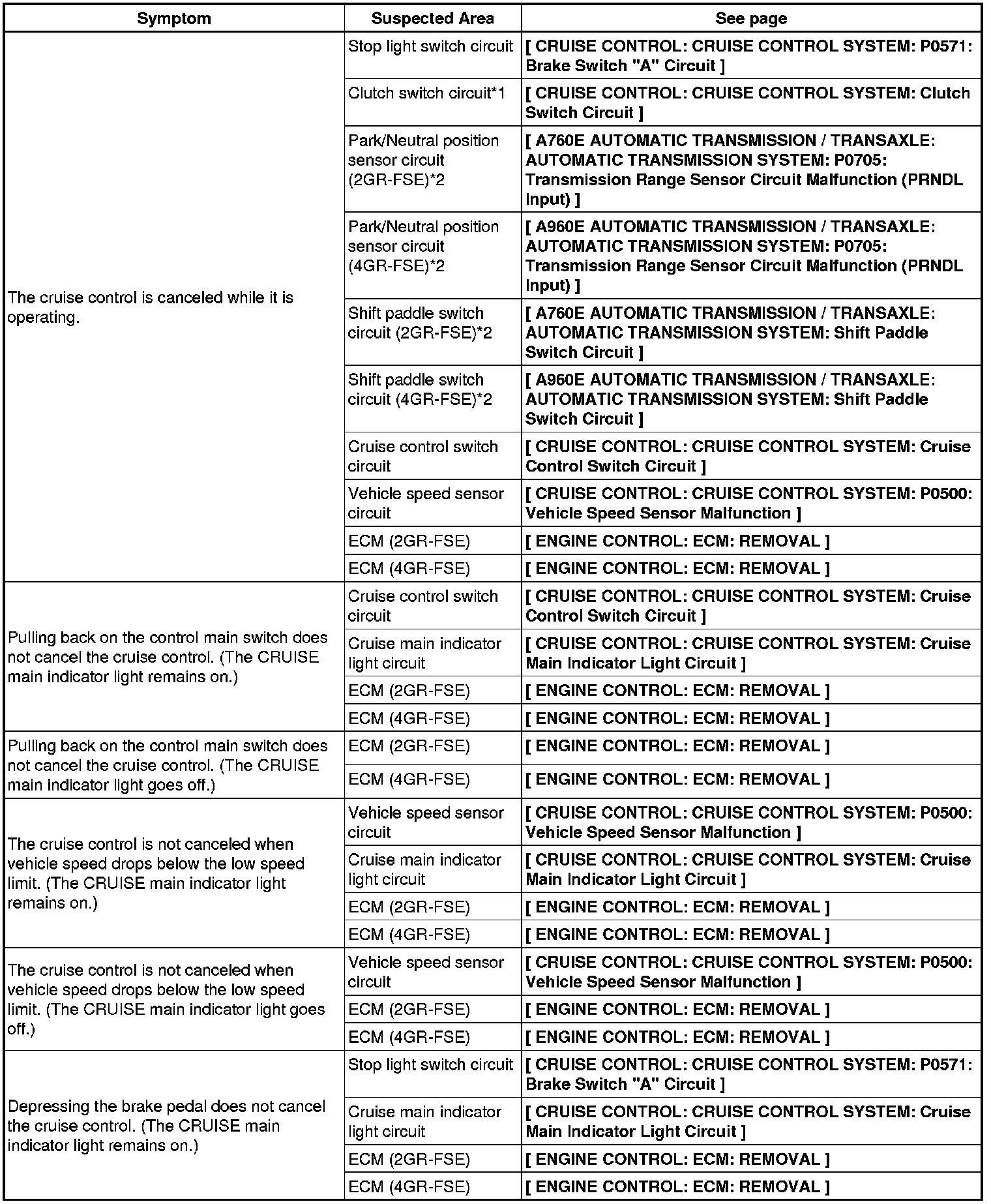 CRUISE CONTROL: CRUISE CONTROL SYSTEM: PROBLEM SYMPTOMS TABLE