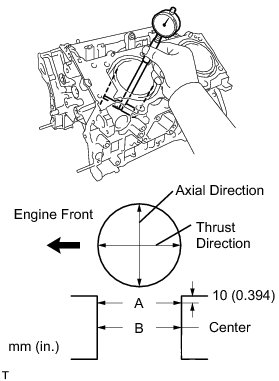 (b) Using a cylinder gauge, measure the cylinder bore diameter at positions A and B in the thrust and axial directions.
