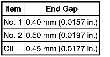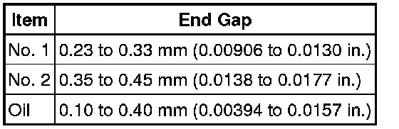 If the end gap is greater than the maximum, replace the piston ring. If the end gap is greater than the maximum even with a new piston ring, rebore all the 6 cylinders or replace the cylinder block sub-assembly.