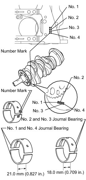 (i) If replacing a bearing, replace it with one having the same number. If the number of the bearing cannot be determined, select the correct bearing by adding together the numbers imprinted on the cylinder block and crankshaft, then refer to the table below for the appropriate bearing number. There are 5 sizes of standard bearings, marked "1", "2", "3", "4" and "5" accordingly.