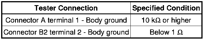* If the results match the values specified above, an open circuit exists between terminal 1 of connector B2 and terminal 1 of connector C.