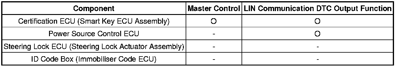 The LIN communication system is used for communication between the components in the tables below. If communication cannot be performed through LIN communication because of an open in the communication lines or other reason, the master control ECU of the relevant system will output a DTC. Refer to the table below about the communication bus lines and connected components.