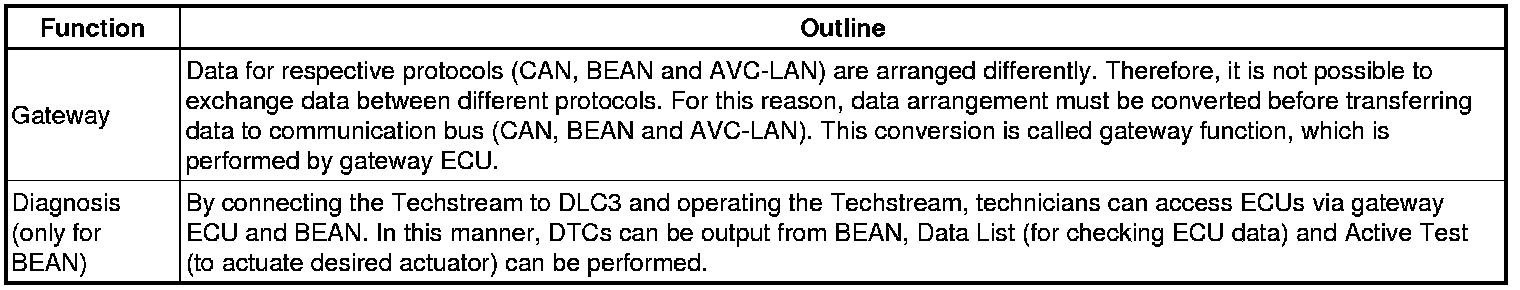 (1) The CAN, BEAN and AVC-LAN protocols have set guidelines for data. The guidelines include communication speed, type of communication wire, drive type and data length. These guidelines are established to facilitate ECU data communication.