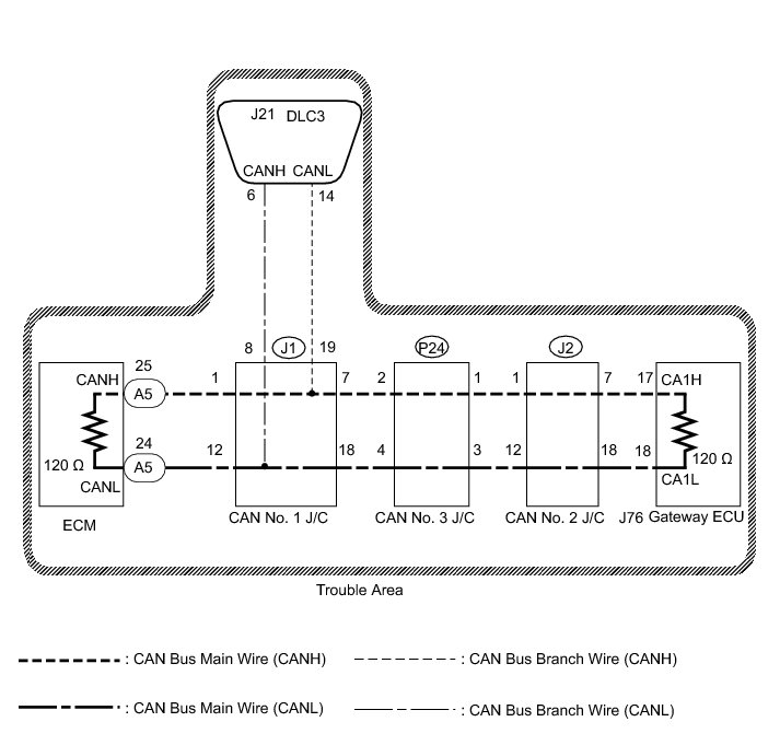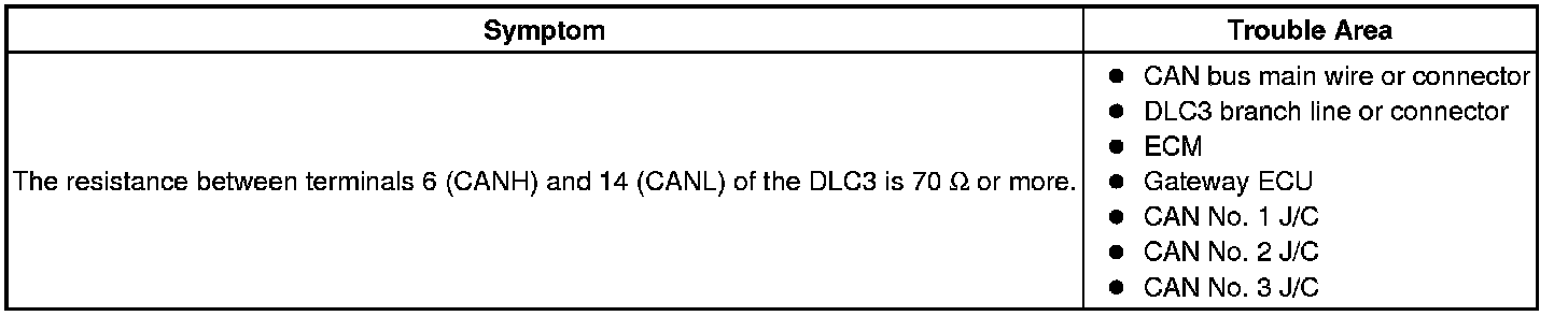 There may be an open circuit in the CAN main bus and/or the DLC3 bus branch when the resistance between terminals 6 (CANH) and 14 (CANL) of the DLC3 is 70 Ohms or more.